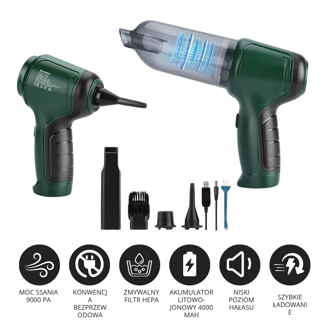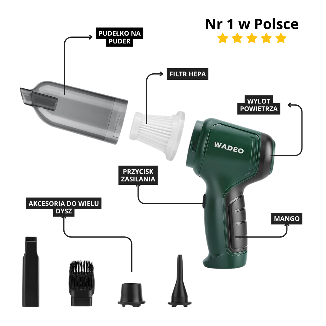 Odkurzanie, dmuchanie i pompowanie w jednym: Używaj jako odkurzacza, do czyszczenia trudno dostępnych miejsc lub jako pompki do dmuchania kółek pływackich czy odsysania powietrza z worków próżniowych.